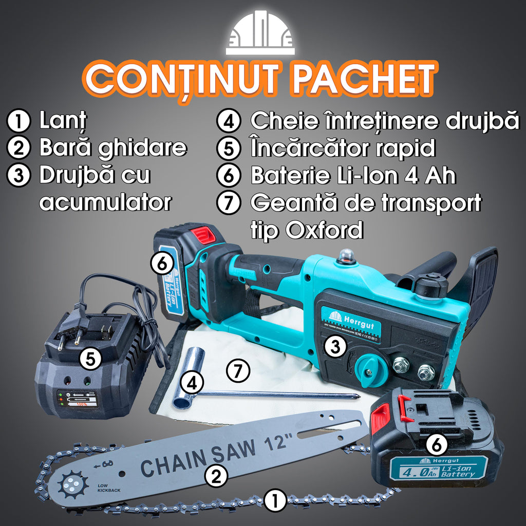1 x Incarcator, 1 x lama, 1 x lant, 1 x lant,1 x Cutie transport, 1 x protectie lama, 1 x Mini fie, 2 x Acumulatori 4000 mAhrastrau,