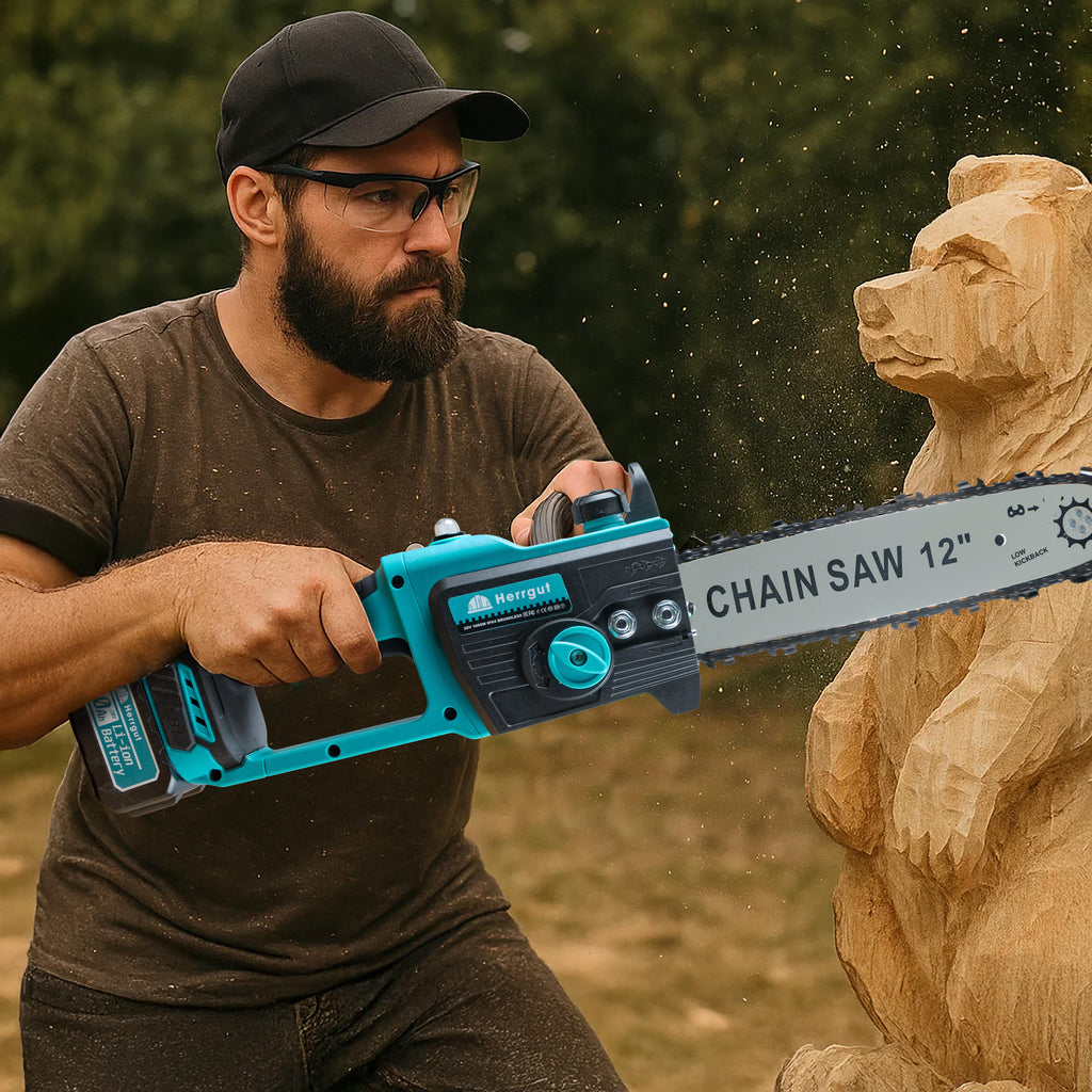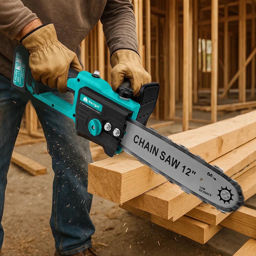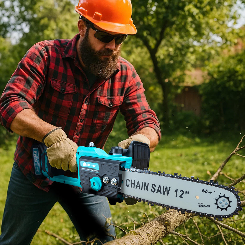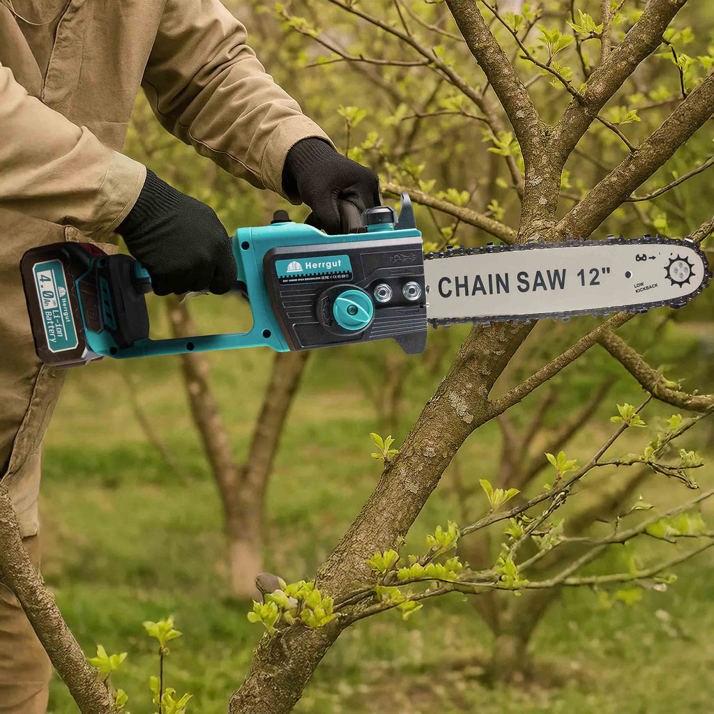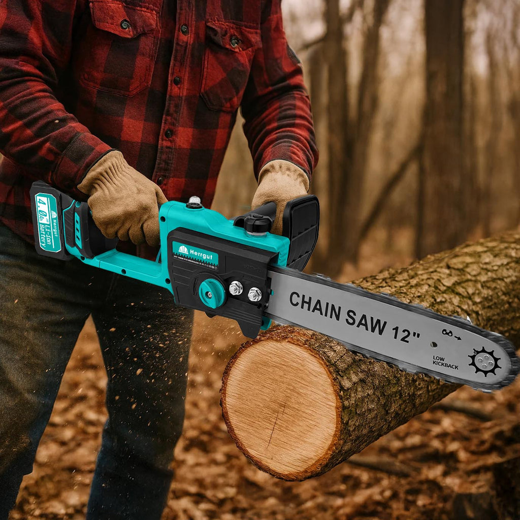 Mini fierastrau electric cu lant Herrgut, motor fara perii, 12 inch, 2 x baterie 4000 mAh, putere 1200W, fast charging, pe acumulator, cu sistem de lubrifiere, albastru/negru, (mini drujba)