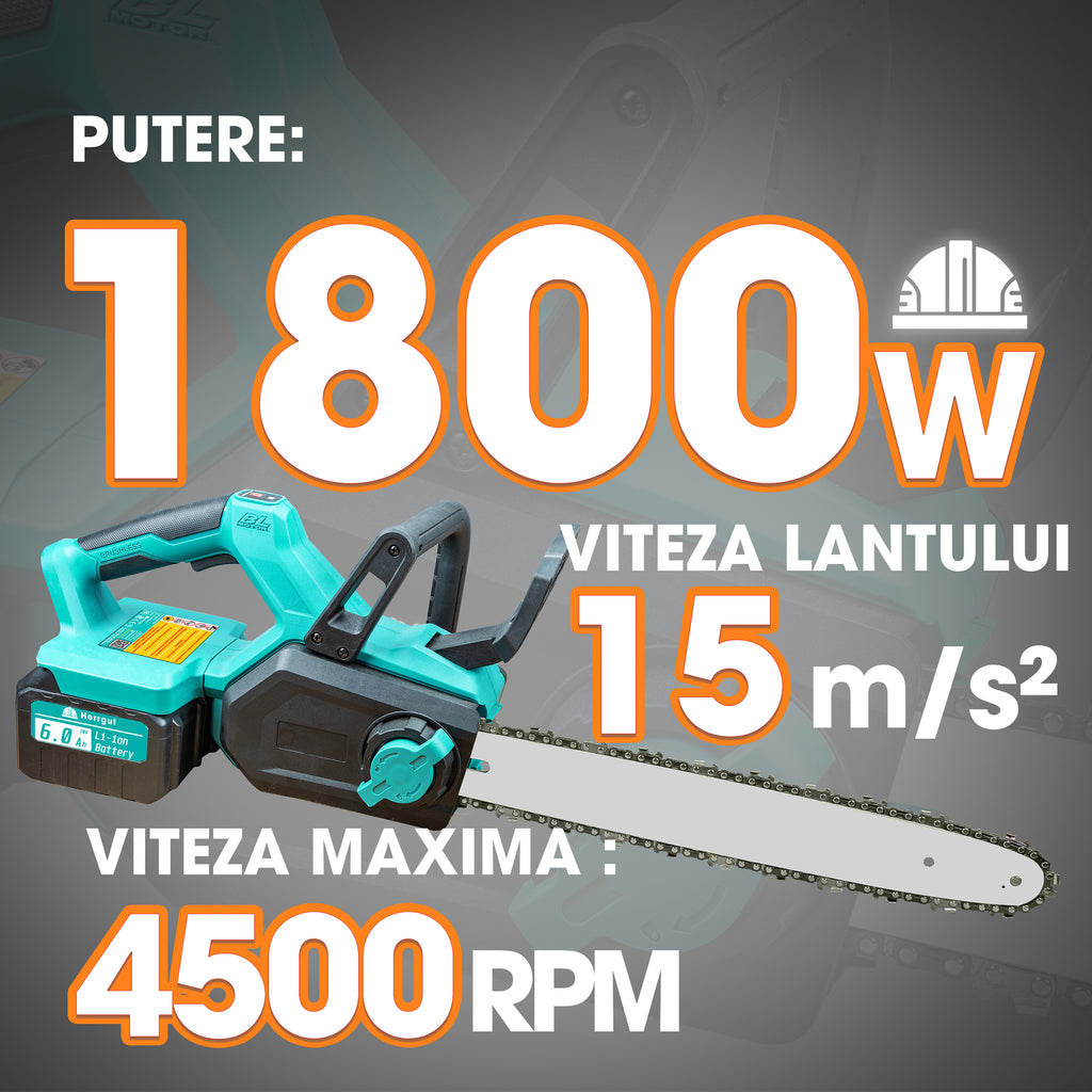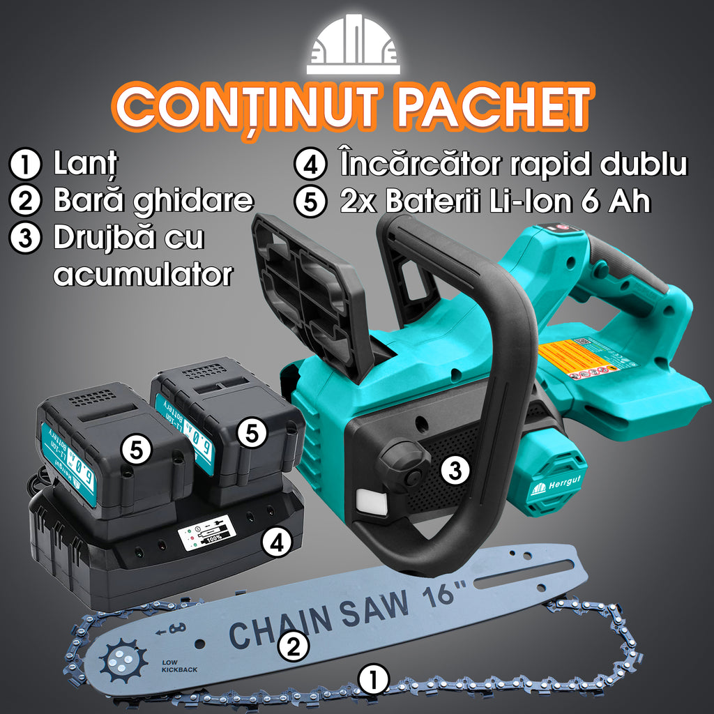 Fierastraul electric cu lant Herrgut 16 inch, motor fara perii, 1800W este solutia ideala pentru lucrari de taiere mai complexe, fie ca este vorba de pregatirea lemnelor de foc, toaletarea copacilor sau lucrari de gradinarit intensive. Lama de 40 cm permite taierea eficienta a ramurilor groase si a bustenilor de dimensiuni medii, in timp ce motorul fara perii ofera putere constanta, durabilitate si intretinere redusa. Echipat cu doua baterii Li-Ion de 6000 mAh si tehnologie fast charging, acest fierastrau garanteaza autonomie extinsa si libertate totala de miscare – oriunde, de la curte la cabana sau teren forestier. Sistemul de lubrifiere automata mentine lantul pregatit pentru performanta optima, iar greutatea bine echilibrata si manerul ergonomic asigura confort chiar si in utilizari prelungite. Siguranta este pe primul loc, cu aparatoare pentru lant, buton de blocare si vibratii reduse. Alegand Herrgut, investesti intr-o unealta profesionala, fiabila si construita pentru a rezista.